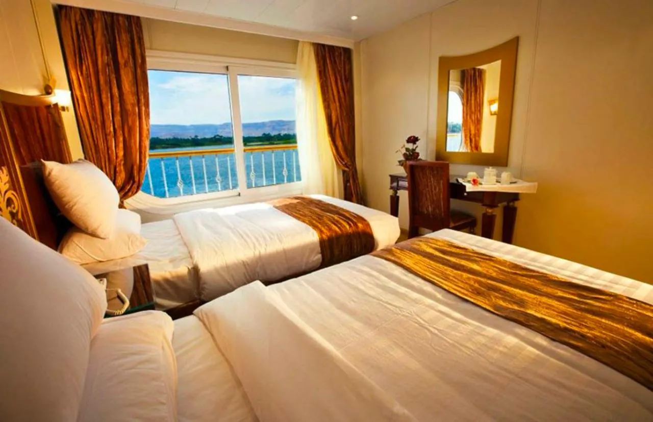 Cruise in style aboard the 5-star Al Hambra, a top-rated Standard Nile cruise ship from Luxor, featuring spacious cabins with panoramic Nile views, elegant interiors, and exceptional comfort. - All-Inclusive, Worry-Free Experience