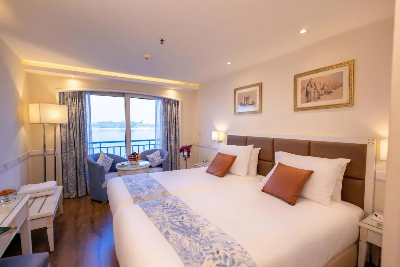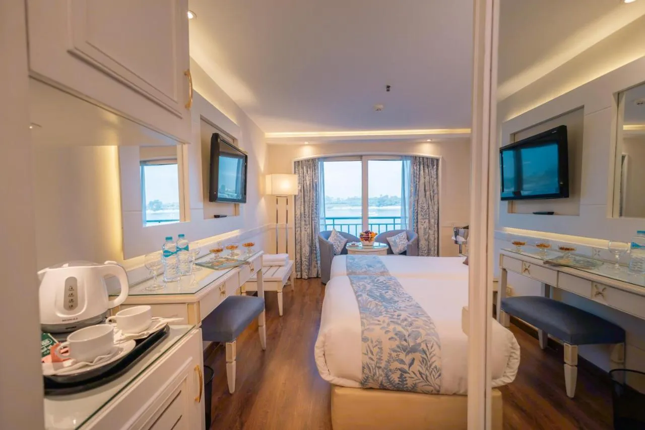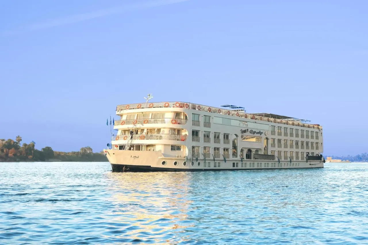 on the Nile Cruise in style aboard the 5-star MS Tower Prestige, a top-rated Deluxe Nile cruise ship from Luxor, featuring spacious cabins with panoramic Nile views, elegant interiors, and exceptional comfort.
